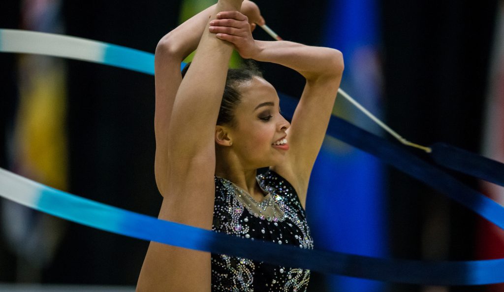 Kaedyn Lashley, of HPTC International, competes in the women’s senior high performance clubs and ribbon competition B event at the 2017 Rhythmic Gymnastics Canadian Championships at the Kinsmen Sports Centre in Edmonton, Alberta on May 21, 2017. (GCG PHOTO: Dave Holland)